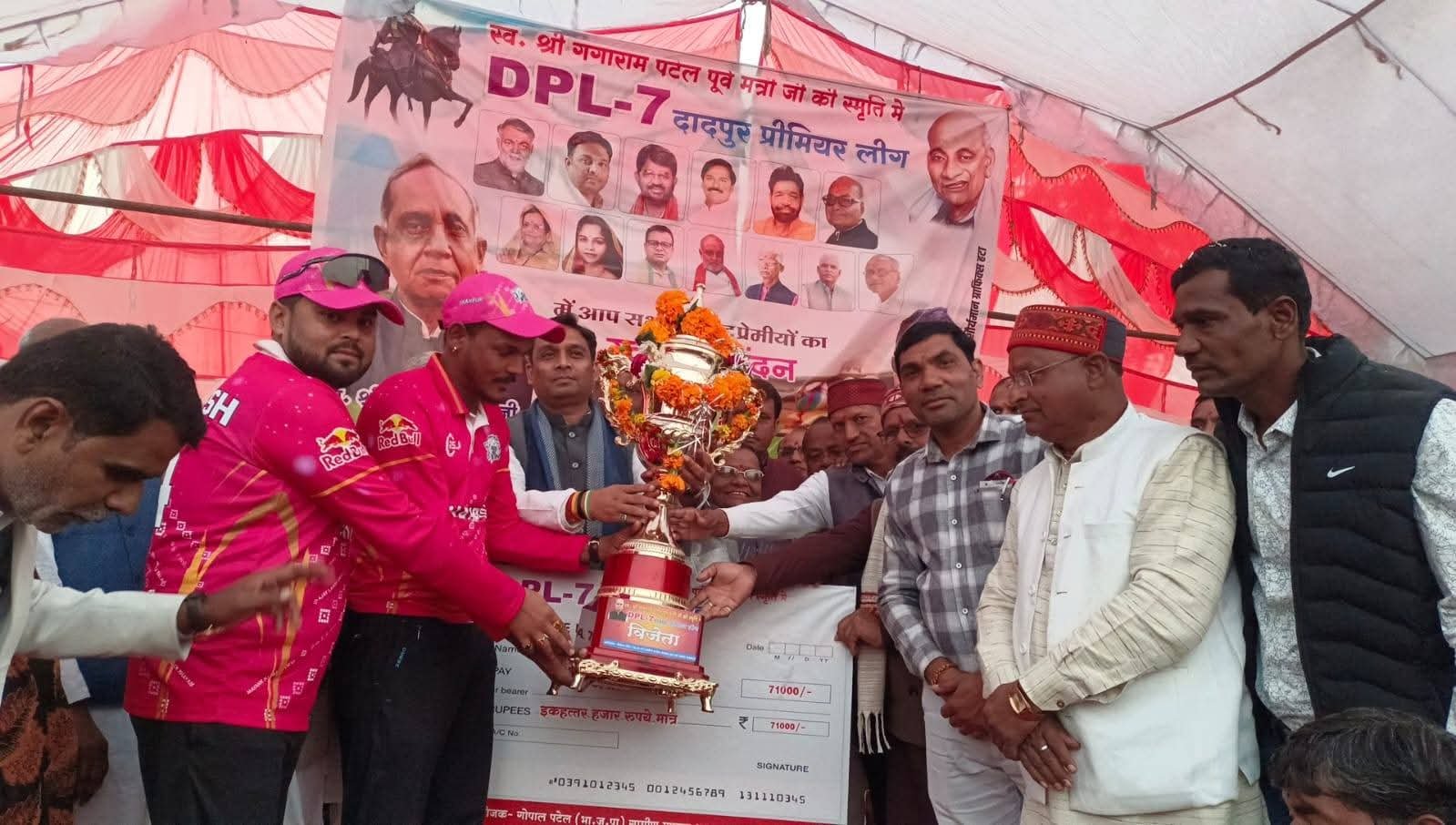 दादपुर गाँव के सरदार वल्लभभाई पटेल खेल मैदान में आयोजित DPL सीजन–7 के फाइनल मुकाबले में शाहपुर (सागर) की टीम ने शानदार प्रदर्शन करते हुए NCC धौर्रा को 7 विकेट से पराजित कर खिताब अपने नाम किया।