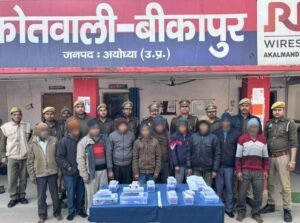 कोतवाली पुलिस टीम को डकैती योजना बनाते हुए गोंडा जनपद के निवासी 10 अंतर्जनपदीय आरोपियों को गिरफ्तार करने में सफलता मिली है। सभी के विरुद्ध आर्म्स एक्ट सहित अन्य धारा में रिपोर्ट दर्ज कर चलान करके शनिवार को जेल भेज दिया गया। कोतवाल अमरेंद्र बहादुर सिंह ने बताया कि मुखबिर की सूचना पर शुक्रवार की रात चौरे बाजार पुलिस चौकी क्षेत्र के मंगारी विसुही नदी पुल के नीचे से 10 आरोपियों रिन्कू कुमार, प्रमोद कुमार, रामदयाल, सूर्यभान, आशू, मनोज कुमार आजाद, हरिभान दत्त आरती प्रसाद, श्रवण कुमार और मन्तराम को गिरफ्तार किया गया। आरोपियों के पास से अभियुक्त के पास से 2 अवैध देशी तमंचा 312 बोर 4 जिन्दा कारतूस 312 बोर 4 लोहे की राङ1 प्लास व 1 पेंचकस 9 एन्ड्रावयड फोन, 2 की पैड फोन व 3610 रूपये नकद बरामद किया गया। पूछताझ पर आरोपियों ने बताया कि वह लोग धार्मिक स्थलो पर भीङभाङ मे चोरी व लूटपाट की घटनाएं करते है। तथा जनपद अयोध्या ,वाराणसी, चित्रकूट, प्रयागराज, गोरखपुर, गोण्डा, अमेठी से चोरी व लूटपाट की घटनाओ मे जेल जा चुके है। बताया कि यह गिरोह अन्तर जनपदीय चोरी एव लूटपाट की घटनाएं करने के अभ्यस्त है।