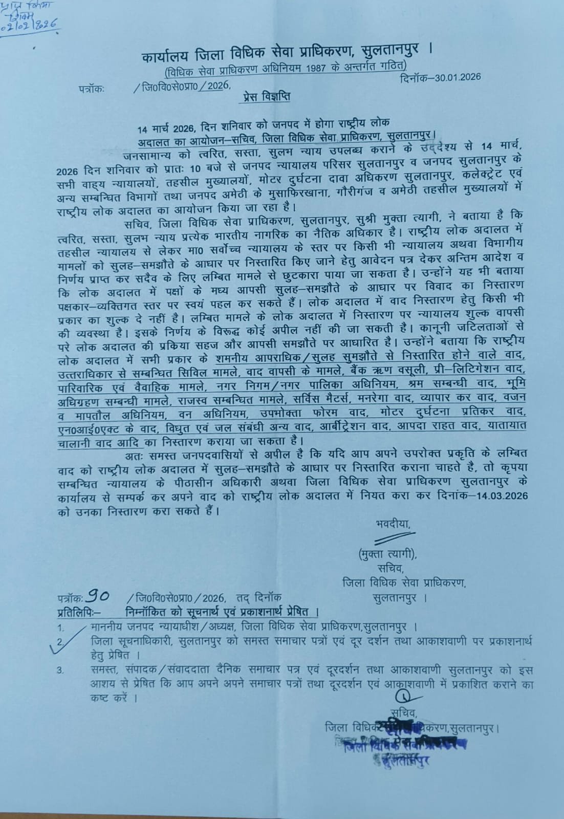सचिव, जिला विधिक सेवा प्राधिकरण सुश्री मुक्ता त्यागी द्वारा अवगत कराया गया है कि जनसामान्य को त्वरित, सस्ता, सुलभ न्याय उपलब्ध कराने के उद्देश्य से 14 मार्च, 2026 दिन शनिवार को प्रातः 10 बजे से जनपद न्यायालय परिसर सुलतानपुर व जनपद सुलतानपुर के सभी वाह्य न्यायालयों, तहसील मुख्यालयों, मोटर दुर्घटना दावा अधिकरण सुलतानपुर, कलेक्ट्रेट एवं अन्य संबंधित विभागों तथा जनपद अमेठी के मुसाफिरखाना, गौरीगंज व अमेठी तहसील मुख्यालयों में राष्ट्रीय लोक अदालत का आयोजन किया जा रहा है।